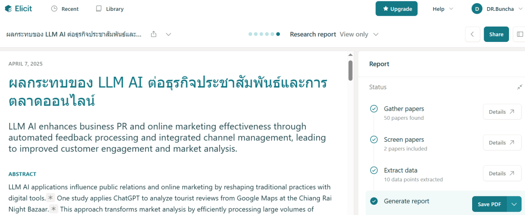 ในประเด็น ผลกระทบของ LLM AI ที่มีต่อธุรกิจ elicit ให้สรุปงานวิจัยที่เกี่ยวข้อง โดยรวมจาก 50 เปเปอร์ที่พบ (เค้าว่าน่ะ) และให้บันทึกเป็น PDF ได้ด้วย