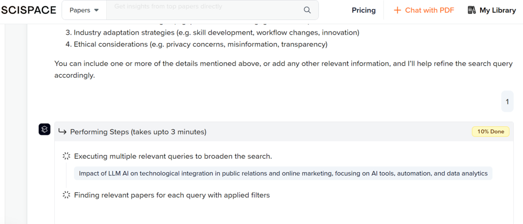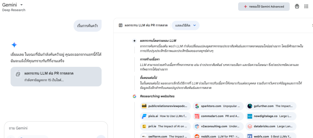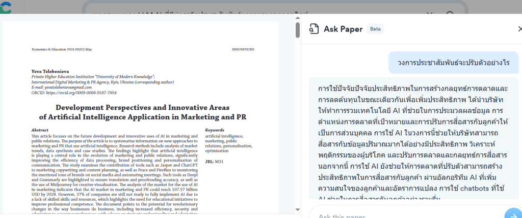 จากคำถาม Prompt ที่ว่า “ผลกระทบของ LLM AI ที่มีต่อธุรกิจประชาสัมพันธ์และการตลาดออนไลน์” SCISPACE ให้คำตอบแบบนี้ …. แสดงกระบวนการคิดด้วย
