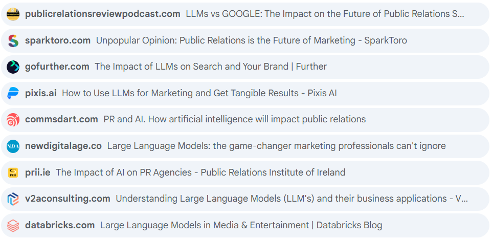 - การเปลี่ยนแปลงจากการค้นหาแบบเดิมไปสู่การดึงข้อมูลที่ขับเคลื่อนด้วย LLM: ความแตกต่างที่สำคัญระหว่างเครื่องมือค้นหาแบบเดิม (เช่น Google) ที่ให้รายการลิงก์ และ LLM ที่ให้คำตอบโดยตรงและสังเคราะห์แก่คำถามของผู้ใช้ กำลังสร้างความรู้สึกที่เป็นแบบสนทนามากขึ้นในการดึงข้อมูล สำหรับผู้เชี่ยวชาญด้านประชาสัมพันธ์ สิ่งนี้หมายถึงความจำเป็นที่สำคัญในการรับรองการนำเสนอแบรนด์ของตนอย่างถูกต้องและเป็นบวกในการตอบสนองที่สร้างโดย AI เนื่องจากผู้ใช้พึ่งพา LLM มากขึ้นสำหรับข้อมูลทันที นอกจากนี้ ยังคงมีความสำคัญอย่างยิ่งในการสร้างเนื้อหาที่มีคุณภาพสูงและน่าเชื่อถือ เช่น ข่าวประชาสัมพันธ์ ซึ่งทำหน้าที่เป็นแหล่งข้อมูลที่มีค่าสำหรับการฝึกอบรม LLM และมีอิทธิพลต่อความเข้าใจเกี่ยวกับแบรนด์และหัวข้อต่างๆ การเติบโตของ LLM ในฐานะแหล่งข้อมูลหลักจึงกำหนดให้แบรนด์ต้องปรับเปลี่ยนวิธีการสร้างเนื้อหาและการจัดการสถานะออนไลน์ โดยให้ความสำคัญกับคุณภาพและความน่าเชื่อถือของข้อมูลเพื่อสร้างอิทธิพลต่อการเล่าเรื่องที่ขับเคลื่อนด้วย AI อย่างมีประสิทธิภาพ.
