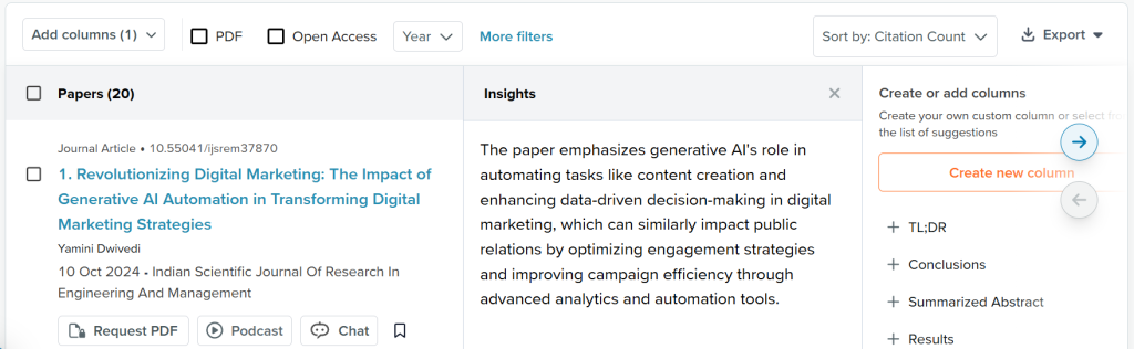 หลังจากนั้น ก็ให้ผลลัพธ์เป็น 20 เปเปอร์ที่เกี่ยวข้อง พร้อมใจความสำคัญ หรือ “Insights” ของแต่ละเปเปอร์ และที่สำคัญ สามารถโหลด PDF ได้เลย