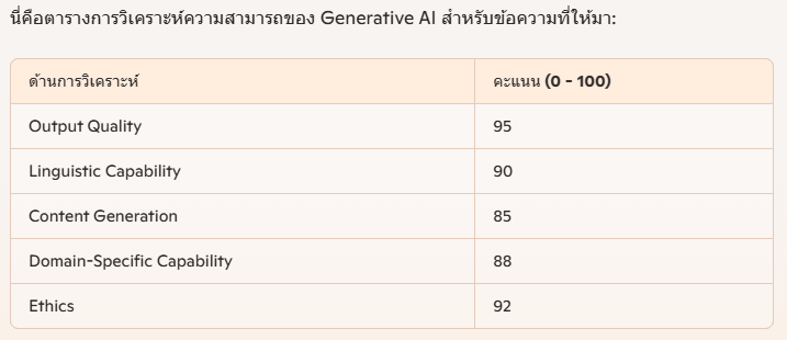 หมายเหตุ: การให้คะแนนความสามารถของ Generative AI ในแต่ละด้านเป็นการประเมินเชิงคุณภาพที่ขึ้นอยู่กับปัจจัยหลายประการ เช่น ความซับซ้อนของข้อความ, คุณภาพของโมเดล AI ที่นำมาใช้, และบริบทในการใช้งาน ดังนั้น คะแนนที่ให้เป็นเพียงค่าประมาณการ