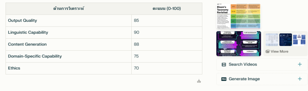 | Content Generation | 85 | สามารถสร้างเนื้อหาที่ครอบคลุมประเด็นสำคัญ แต่ยังสามารถเพิ่มตัวอย่างหรือกรณีศึกษาเพื่อเพิ่มความสมบูรณ์ของข้อมูล |