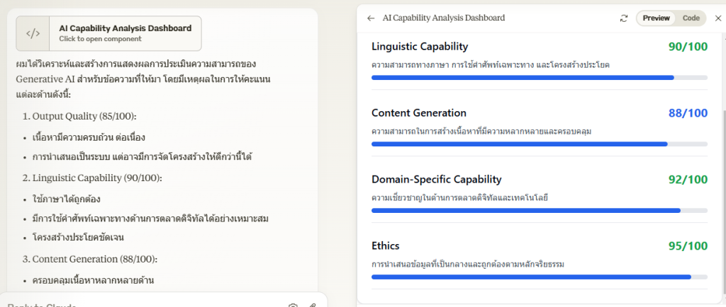 ทางด้านความสามารถ claude.ai จะนำเสนอคะแนน คำอธิบายสั้น ๆ และแสดงผลเป็นสีสวยงามดังรูป