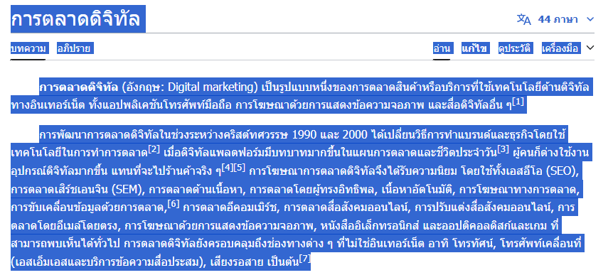 เพื่อความเป็นธรรมกับทุกเจ้า เราจะใช้ข้อความที่มีในอินเตอร์เน็ต และคิดว่า AI เหล่านี้ ได้เห็นข้อความนี้แล้ว ซึ่งเราได้หยิบมาจาก https://th.wikipedia.org/wiki/ ในหัวเรื่อง “การตลาดดิจิทัล” ดังรูป