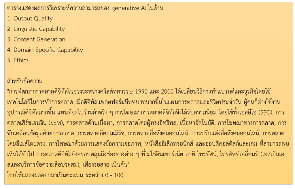 ตารางวิเคราะห์ความสามารถของ Generative AI สำหรับข้อความที่กำหนด