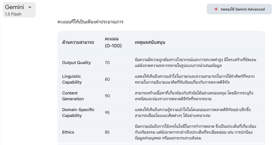 - Content Generation: สามารถสร้างเนื้อหาที่ครอบคลุม แต่ยังขาดการวิเคราะห์เชิงลึกเกี่ยวกับแนวโน้มในอนาคตของการตลาดดิจิทัล
